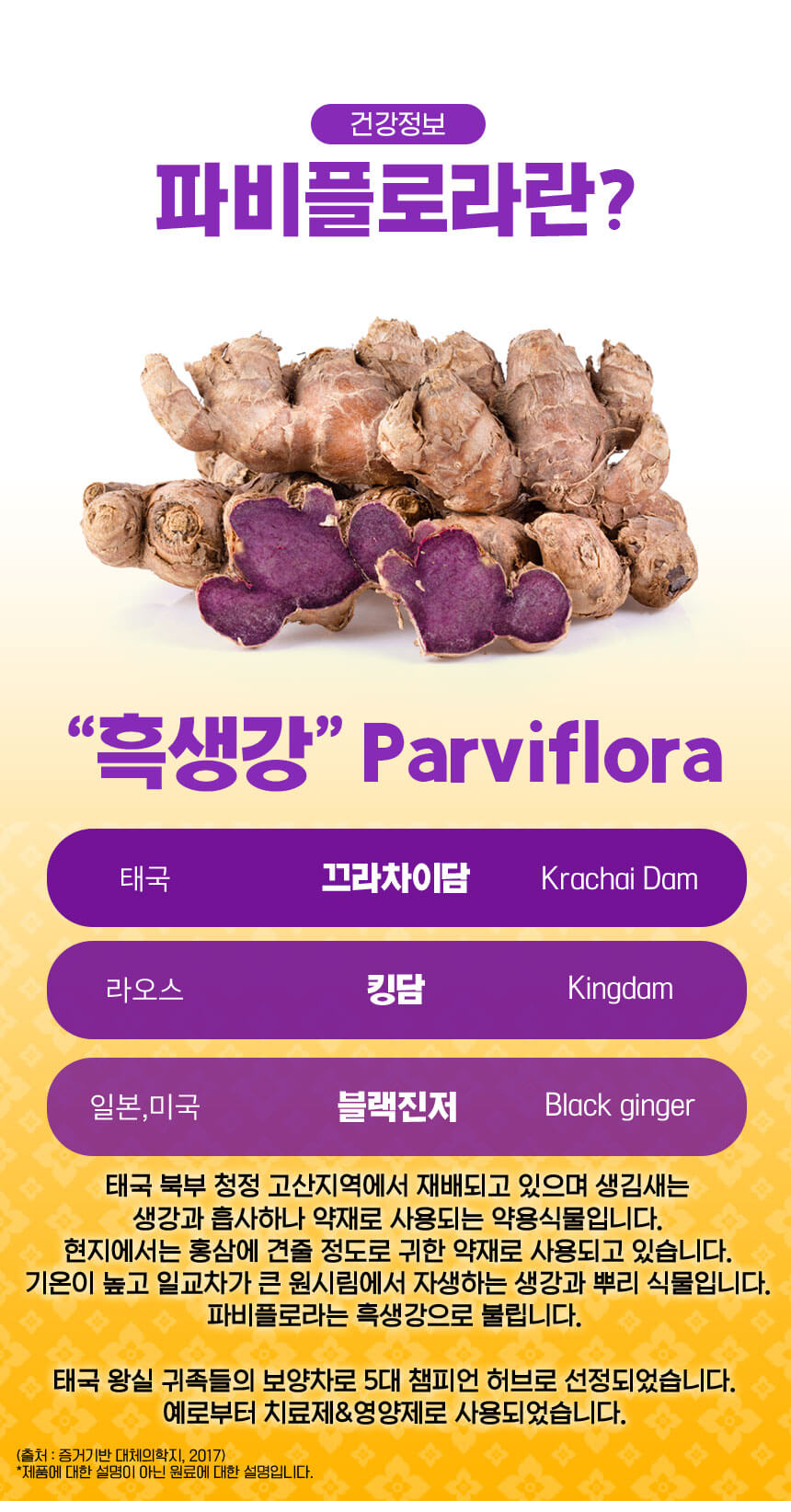 파비플로라의 주요 성분은 끄라차이담(Krachai Dam)입니다. 태국에서 자생하는 흑생강의 일종으로, 오래전부터 활력 증진과 면역력 개선에 사용되어 왔습니다. 최근엔 체지방을 줄이고, 기초대사량을 높여주는 효과까지 입증되어 다이어트 보조제로 급부상 중입니다.