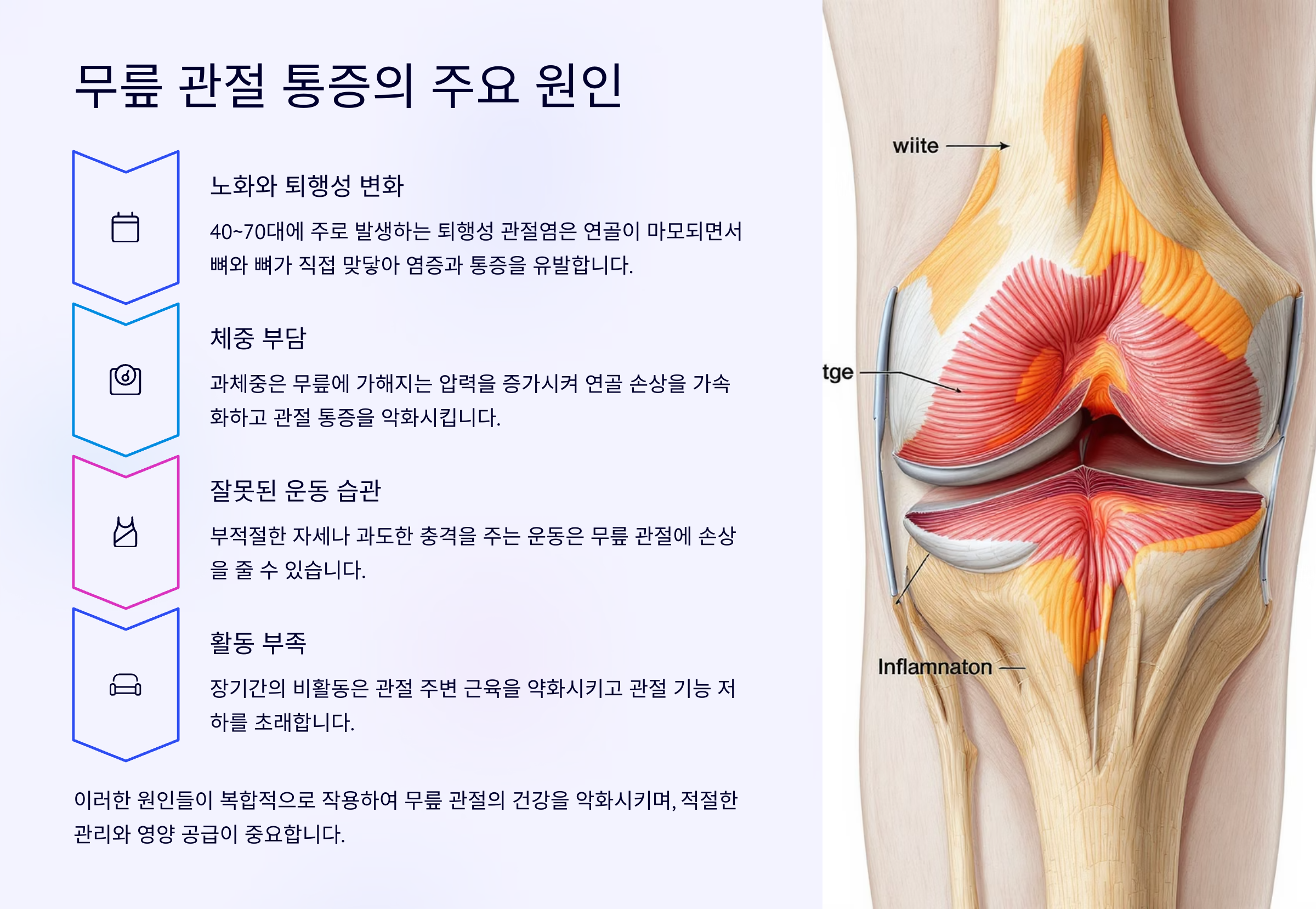 무릎 통증은 노화, 체중, 생활 습관 등 다양한 원인으로 발생하지만, 초기에 관리하면 증상 완화는 물론 삶의 질을 높일 수 있습니다.