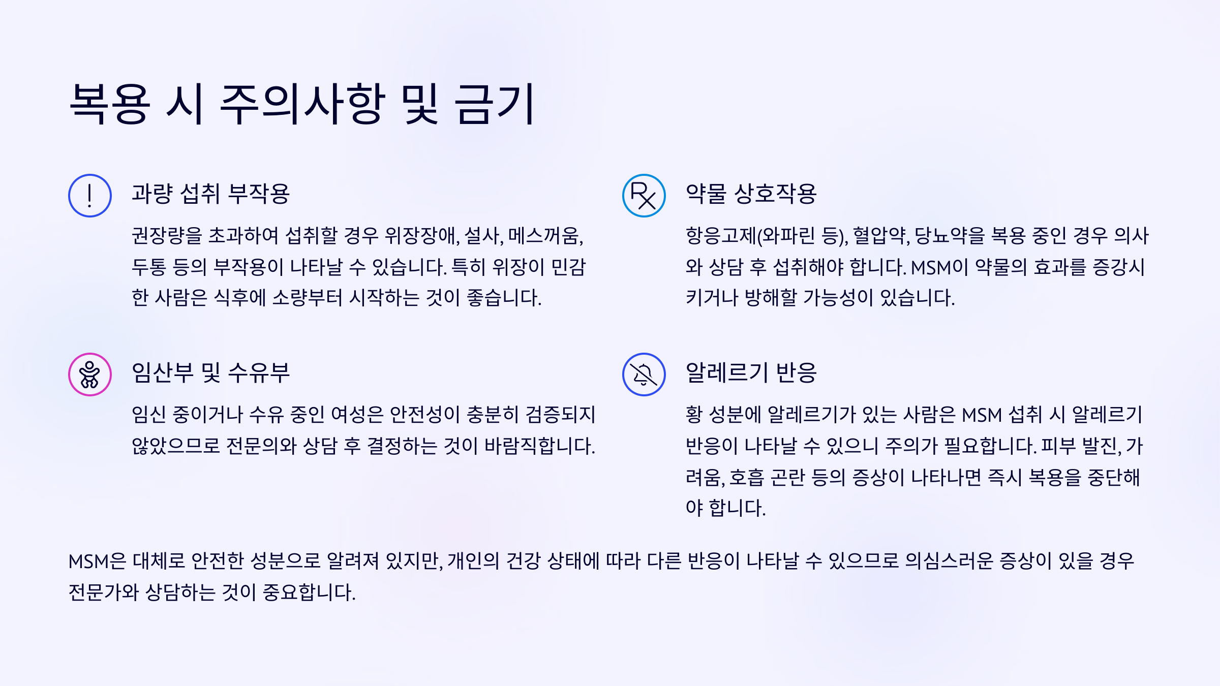 👉 MSM은 건강기능식품으로 분류되며, 의약품은 아닙니다. 하지만 관절 건강을 위한 보조제로 널리 활용됩니다.