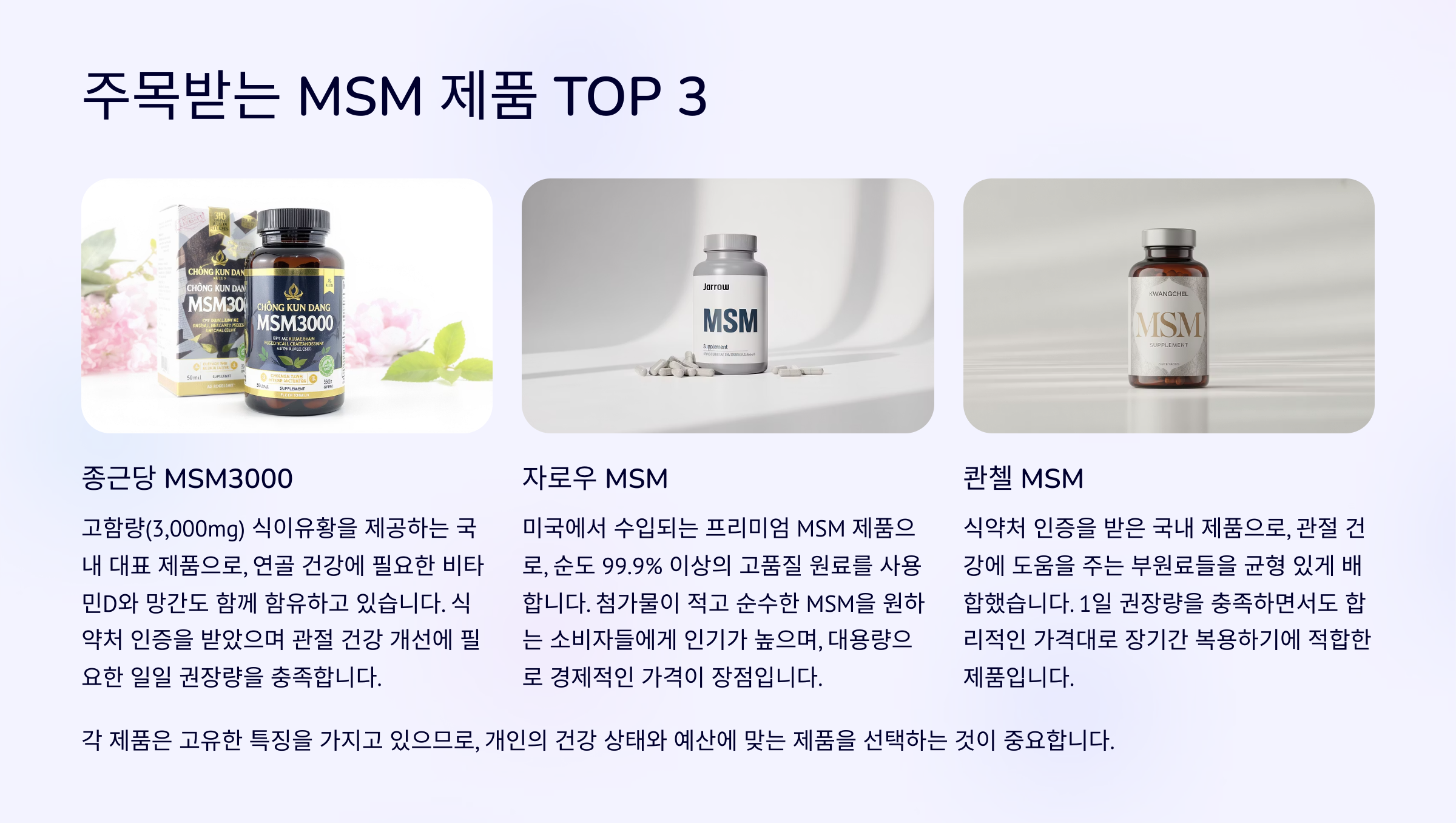 그리고 종근당 MSM3000, 자로우 MSM, 콴첼 MSM 등 제품 정보와 함께